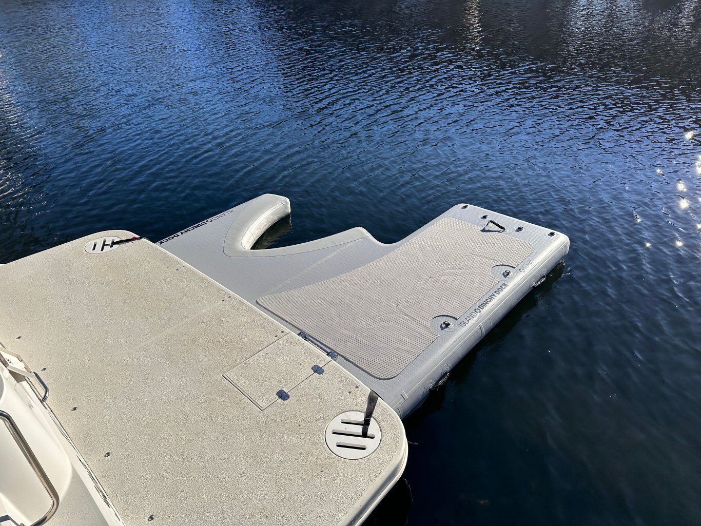 Inflate the Dinghy Dock after arriving at your mooring and dock your dinghy with ease. Its innovative design allows you to beach your dinghy on the pad, providing a stable platform for safe and easy boarding and exiting, thanks to three water ballasts underneath. The top surface features EVA non-skid foam for excellent grip, and D-rings along both sides make it simple to secure to your swim platform. The versatile 8’ x 8’ square design allows for parallel or perpendicular use.